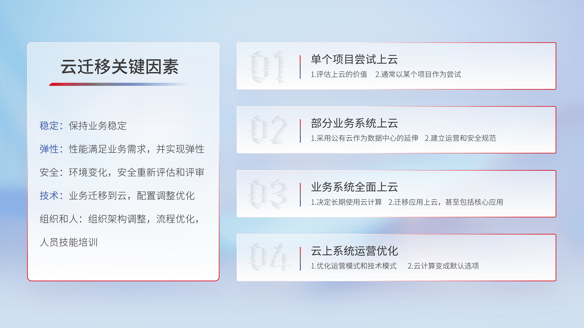 结合实际业务,,,,从规划设计、、、云平台选型、、云原生改造、、、、数据迁移、、、、集成交付,,迁移全过程为客户识别最佳上云路径,,做好风险识别管理,,设计网络架构、、身份权限、、安全审计合规、、、操作审计、、、、日志审计、、、监控告警策略、、、多站点容灾设计等,,,,对云上基础设施进行整体规划,,,,提升IT治理水平,,,以满足弹性、、高可用、、、高性能的需求。。